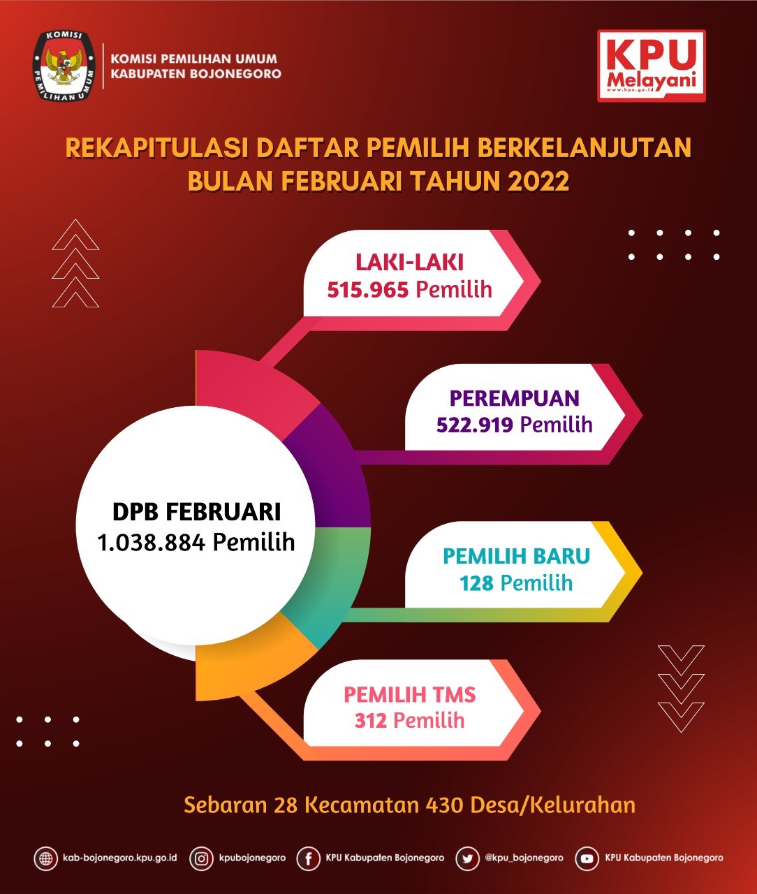Adanya penambahan dan pengurangan jumlah pemilih tersebut, menyebabkan total jumlah pemilih pada bulan Februari 2022 mencapai 1.038.884 pemilih, dengan rincian laki-laki sejumlah 515.965 pemilih dan perempuan sejumlah 522.919 pemilih. (mit/pin)