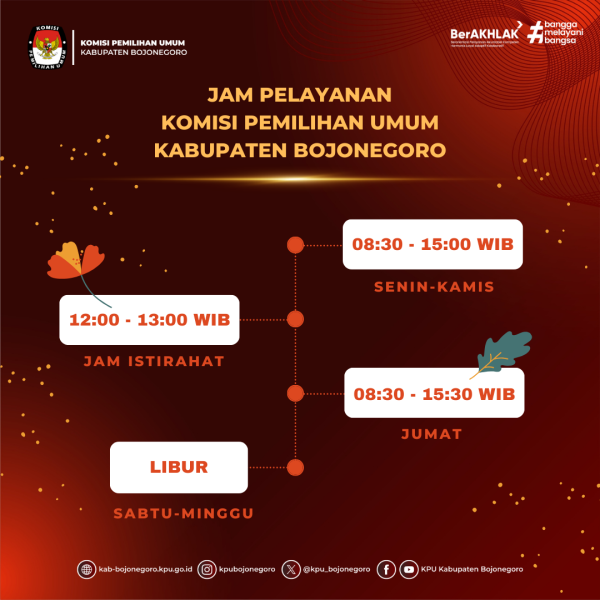 Teman Pemilih, berikut kami sampaikan Jam Pelayanan Komisi Pemilihan Umum Kabupaten Bojonegoro.