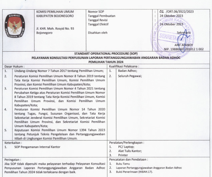 Standar Operasional Prosedur (SOP) Pelayanan Konsultasi Penyusunan Laporan Pertanggungjawaban Anggaran Badan Adhoc Pemilu Tahun 2024