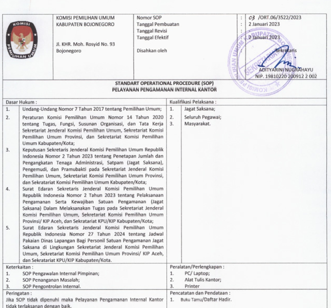 KPU Kabupaten Bojonegoro mempublikasikan SOP Pelayanan Pengamanan Internal Kantor sebagai pedoman pengamanan lingkungan kerja yang aman dan tertib.
