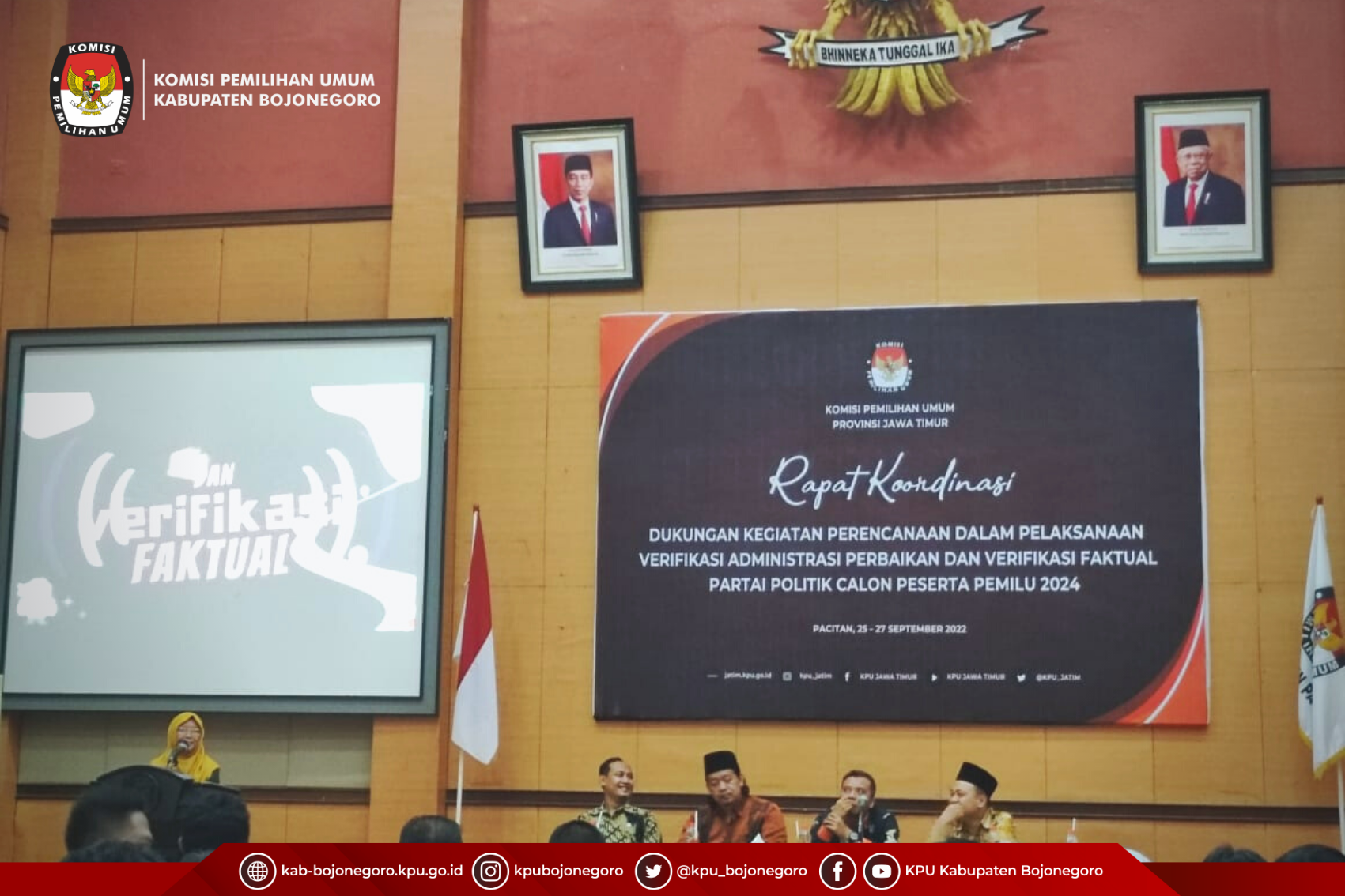 Bojonegoro, kab-bojonegoro.kpu.go.id - Kamis (29/9), KPU Kabupaten Bojonegoro yang diwakili oleh Divisi Teknis Penyelenggaraan (Fatma Lestari), Kasubbag Teknis Pemilu dan Hupmas (Aminodin), dan Operator Sipol (Anis Istiqomah) mengikuti kegiatan Rapat Koordinasi Dukungan Kegiatan Perencanaan Dalam Pelaksanaan Verifikasi Administrasi Perbaikan dan Verifikasi Faktual Partai Politik Calon Peserta Pemilu 2024. Rakor dilaksanakan di Kantor KPU Kabupaten Pacitan dan diikuti oleh 38 KPU Kabupaten/Kota se-Jawa Timur.