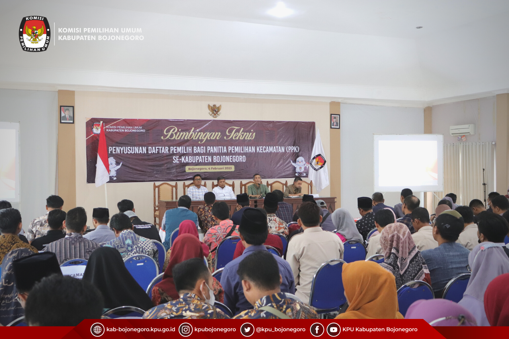 Bojonegoro, https://kab-bojonegoro.kpu.go.id/ - KPU Kabupaten Bojonegoro menyelenggarakan kegiatan Bimbingan Teknis (Bimtek) Penyusunan Daftar Pemilih Bagi Panitia Pemilihan Kecamatan (PPK) se-Kabupaten Bojonegoro pada hari Sabtu, 4 Februari 2023. Bertempat di Aula Lantai 2 Gedung KPU Kabupaten Bojonegoro, kegiatan Bimtek dimulai Pukul 09.30 WIB dan diikuti oleh 140 PPK dari 28 Kecamatan di Bojonegoro serta Bawaslu Kabupaten Bojonegoro.
