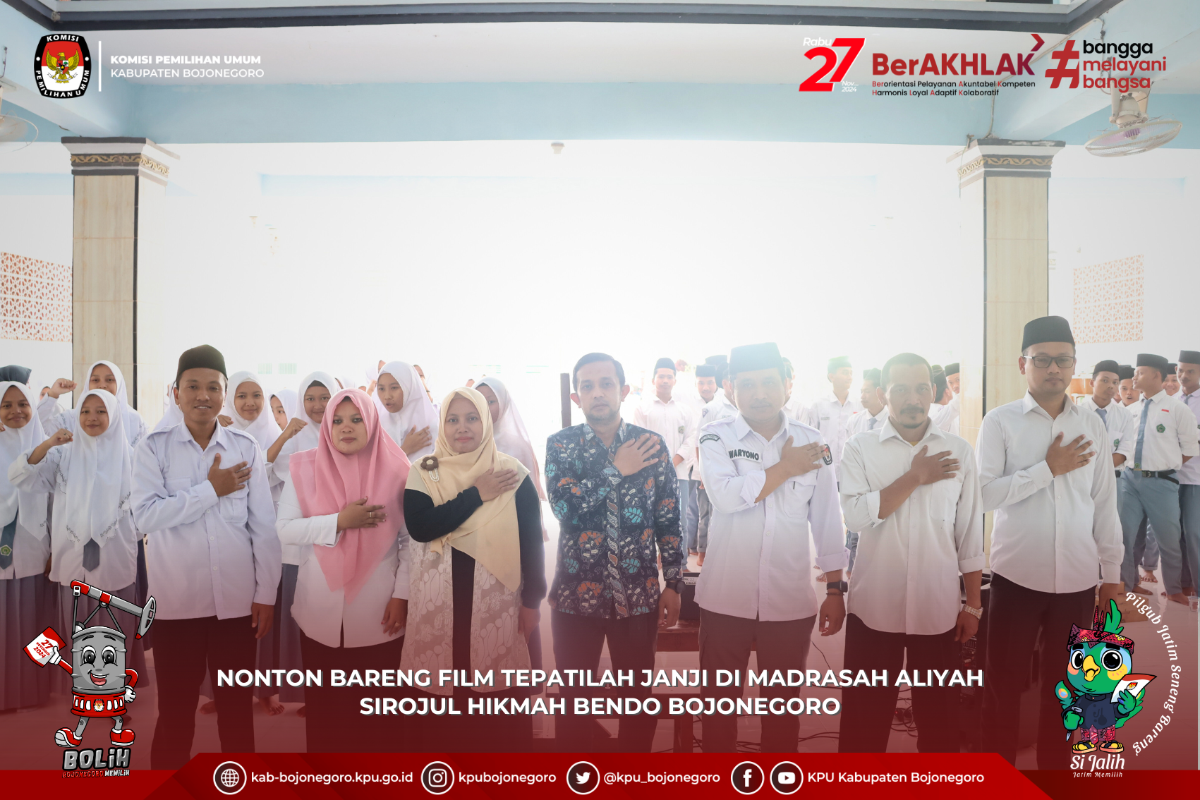 Bojonegoro, kab-bojonegoro.kpu.go.id - KPU Kabupaten Bojonegoro menggelar Nonton Bareng Film Tepatilah Janji dalam rangka memperingati Hari Sumpah Pemuda pada 28 Oktober 2024. Bertempat di Madrasah Aliyah Sirojul Hikmah Desa Bendo Kecamatan Kapas, nobar diikuti oleh siswa-siswi kelas 11 dan kelas 12.