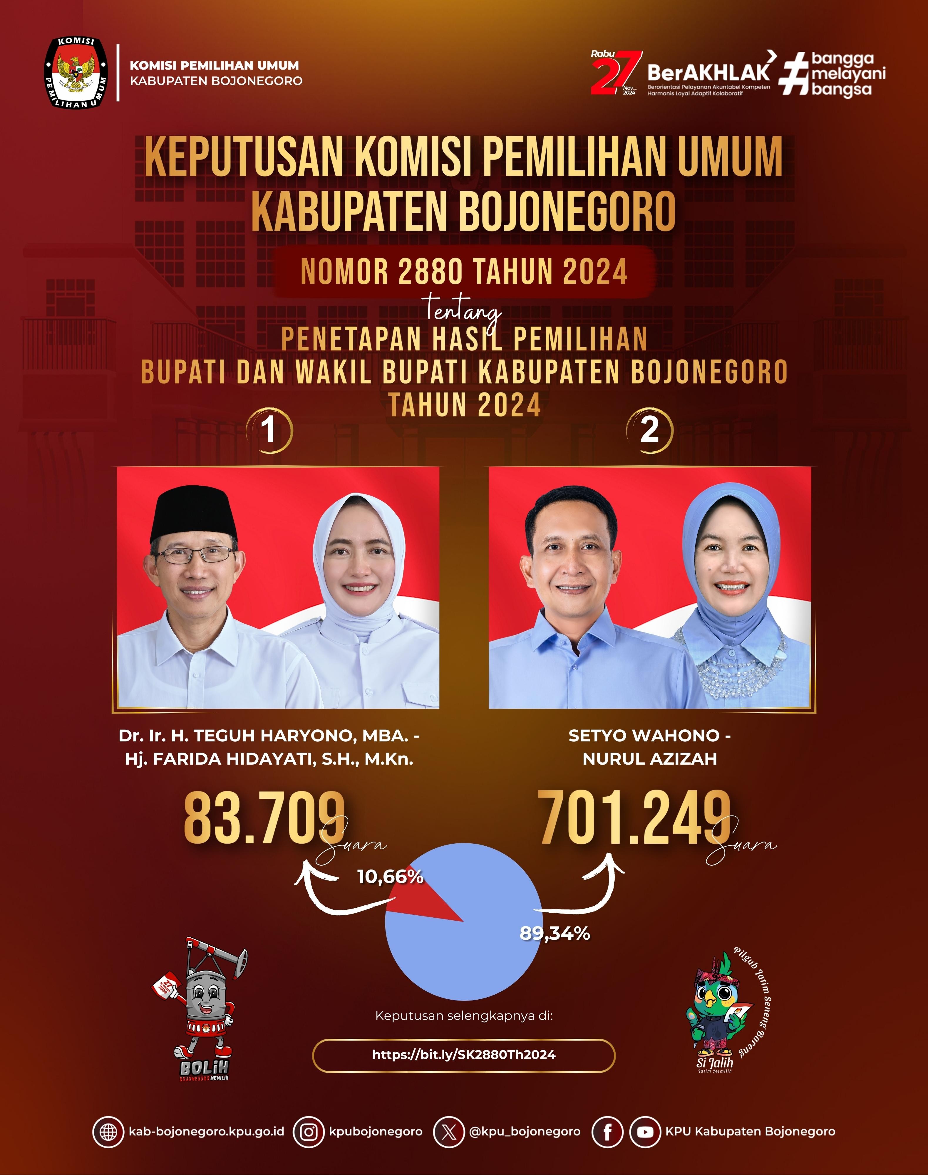 Keputusan Komisi Pemilihan Umum Kabupaten Bojonegoro Nomor 2880 Tahun 2024 tentang Penetapan Hasil Pemilihan Bupati dan Wakil Bupati Kabupaten Bojonegoro Tahun 2024
