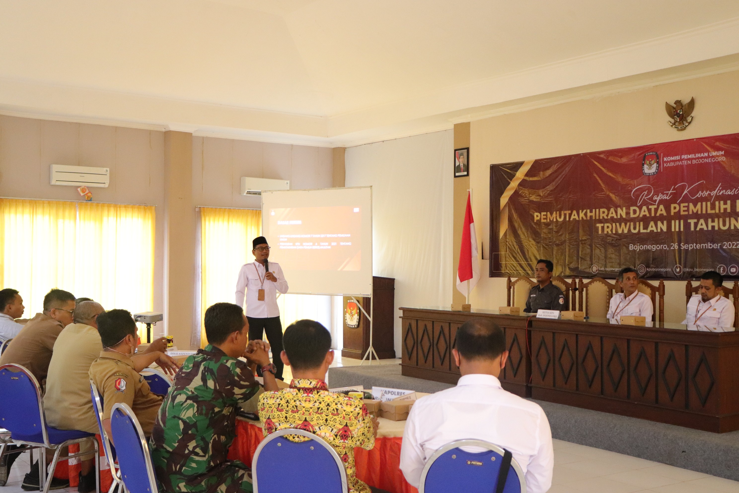 Bojonegoro, kab-bojonegoro.kpu.go.id - Senin (26/9), KPU Kabupaten Bojonegoro melaksanakan Rapat Koordinasi Pemutakhiran Data Pemilih Berkelanjutan (PDPB) Triwulan III Tahun 2022 yang diselenggarakan di Aula Lantai 2 KPU Kabupaten Bojonegoro. Pelaksanaan kegiatan ini merupakan tindak lanjut Peraturan Komisi Pemilihan Umum Nomor 6 Tahun 2021 tanggal 11 November 2021 tentang Pemutakhiran Data Pemilih Berkelanjutan.