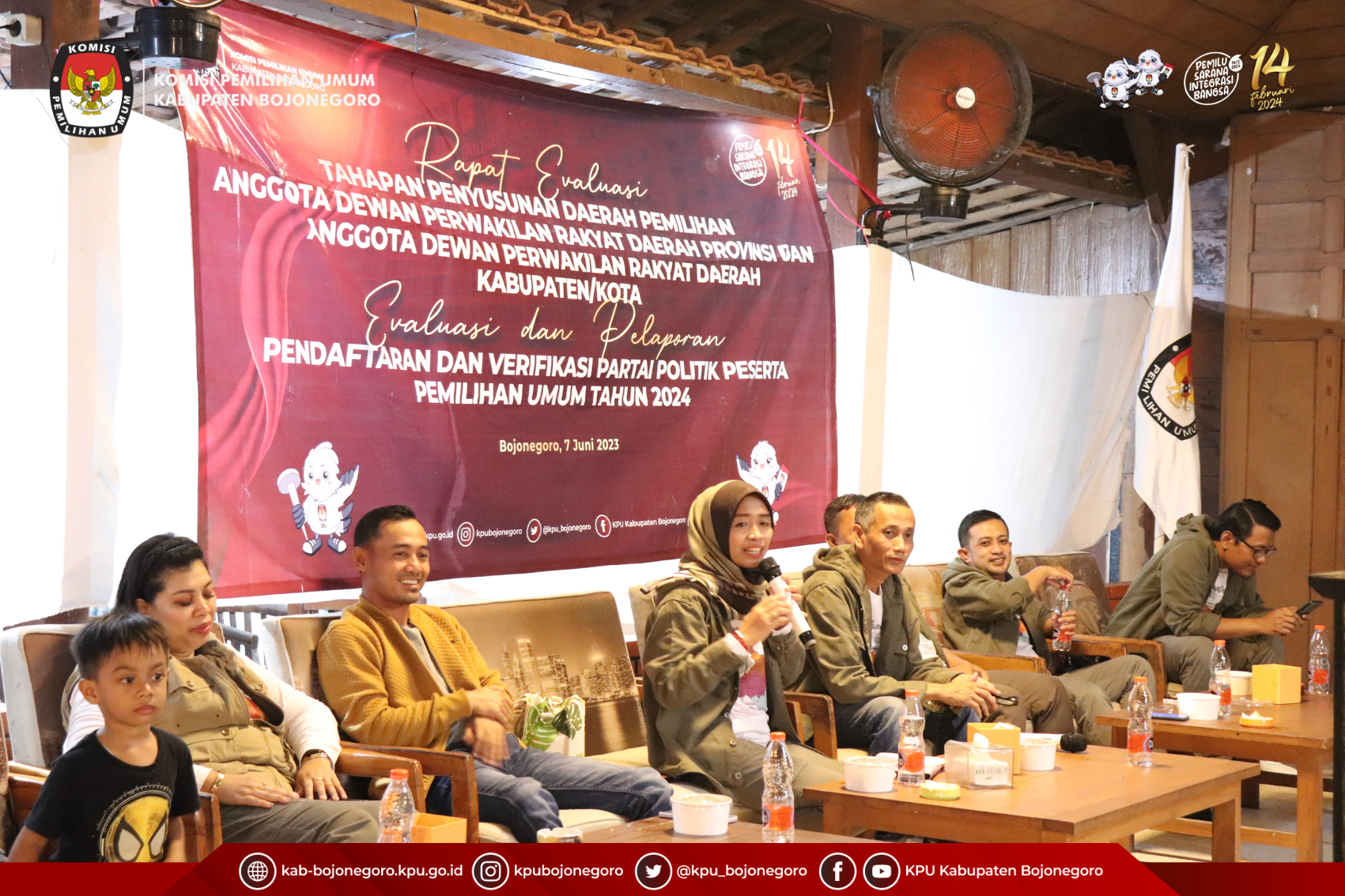Bojonegoro, kab-bojonegoro.kpu.go.id - KPU Kabupaten Bojonegoro melaksanakan kegiatan Rapat Evaluasi Tahapan Penyusunan Daerah Pemilihan Anggota Dewan Perwakilan Rakyat Daerah Provinsi dan Anggota Dewan Perwakilan Rakyat Daerah Kabupaten/Kota; Evaluasi dan Pelaporan Pendaftaran dan Verifikasi Partai Politik Peserta Pemilihan Umum Tahun 2024 pada hari Rabu, 7 Juni 2023. Kegiatan ini diikuti oleh Bawaslu Kabupaten Bojonegoro dan PPK Divisi Teknis Penyelenggaraan, Divisi Hukum dan Pengawasan, Divisi Data dan Informasi se-Kabupaten Bojonegoro mulai Pukul 18.00 WIB dan bertempat di New Garasi Cafe Mulyoagung, Bojonegoro.
