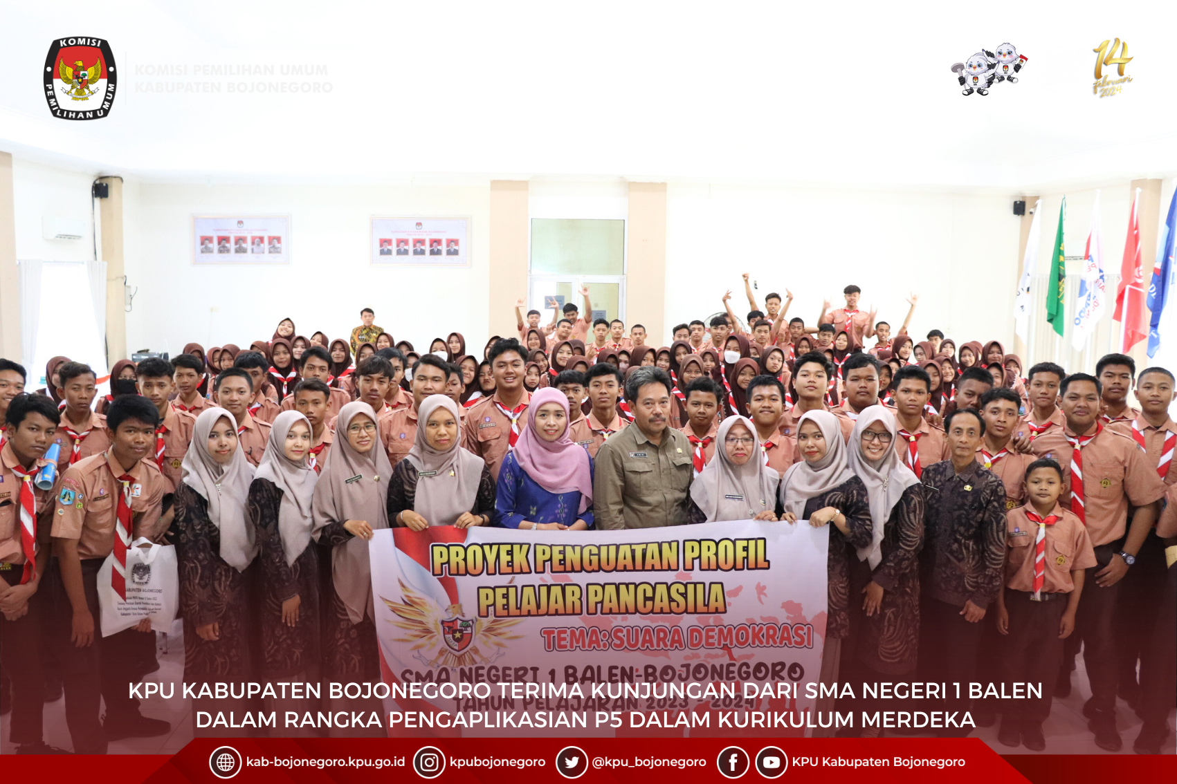 Bojonegoro, https://kab-bojonegoro.kpu.go.id/ - KPU Kabupaten Bojonegoro menerima kunjungan dari SMA Negeri 1 Balen pada Kamis-Jumat (24 Agustus dan 25 Agustus 2023). Kunjungan terbagi dalam 2 hari, pada hari pertama, Kamis, dihadiri oleh 60 siswa kelas 10 dan 5 orang guru. Pada hari kedua, Jumat, dihadiri oleh 128 siswa kelas 11 dan 8 orang guru.