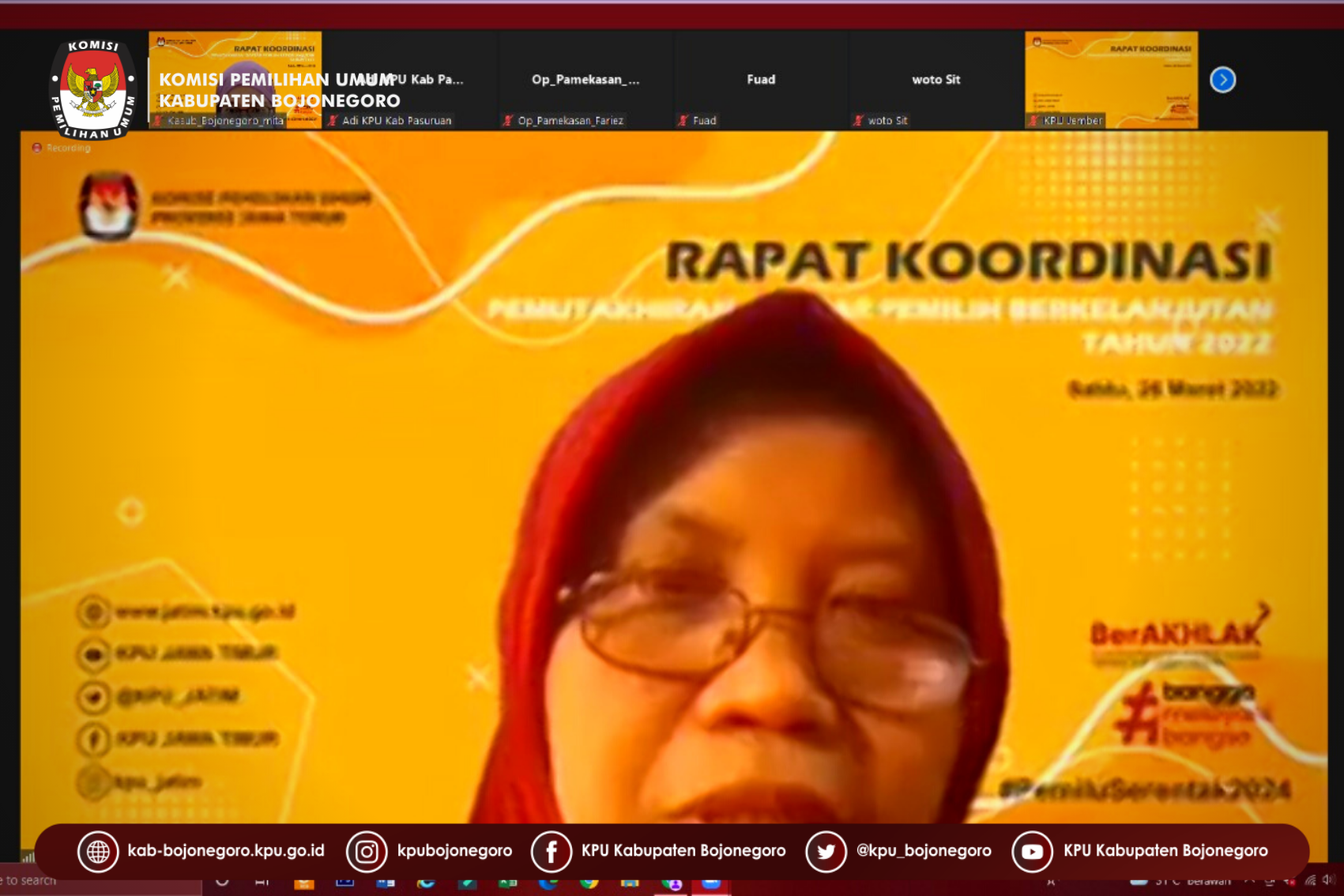 Bojonegoro, kab-bojonegoro.kpu.go.id – KPU Kabupaten Bojonegoro mengikuti kegiatan Rapat Koordinasi Pemutakhiran Daftar Pemilih Berkelanjutan Tahun 2022 yang dilaksanakan oleh KPU Provinsi Jawa Timur melalui zoom meeting (Sabtu, 26/03/2022). Peserta rapat koordinasi yaitu Anggota KPU Kabupaten/Kota Divisi Perencanaan, Data, dan Informasi, Kepala Sub Bagian Perencanaan, Data, dan Informasi, serta Operator Sidalih.