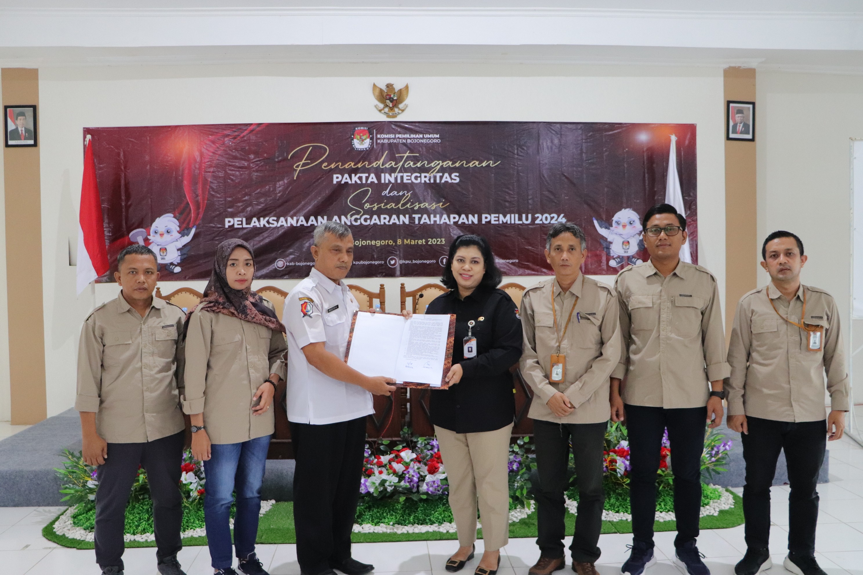 Bojonegoro, http://kab-bojonegoro.kpu.go.id/ - Rabu (8/3), KPU Kabupaten Bojonegoro menyelenggarakan kegiatan Penandatanganan Pakta Integritas dan Sosialisasi Pelaksanaan Anggaran Tahapan Pemilu 2024. Bertempat di Aula Lantai 2 KPU Kabupaten Bojonegoro, kegiatan sosialisasi diikuti oleh Ketua, Sekretaris, dan Staf Sekretariat PPK se-Kabupaten Bojonegoro.