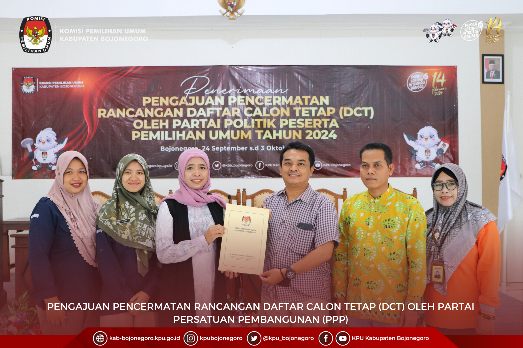 Bojonegoro, kab-bojonegoro.kpu.go.id - Selasa (3/10), KPU Kabupaten Bojonegoro menerima Pengajuan Pencermatan Rancangan Daftar Calon Tetap (DCT) oleh Partai Politik Peserta Pemilu Tahun 2024 Tingkat Kabupaten Bojonegoro. Berdasarkan Keputusan Komisi Pemilihan Umum Nomor 996 Tahun 2023 tentang Pedoman Teknis Penyusunan Daftar Calon Sementara dan Penetapan Daftar Calon Tetap Anggota Dewan Perwakilan Rakyat, Dewan Perwakilan Rakyat Daerah Provinsi, dan Dewan Perwakilan Rakyat Daerah Kabupaten/Kota sebagaimana telah diubah dengan Keputusan Komisi Pemilihan Umum Nomo 1026 Tahun 2023, jadwal Pengajuan Pencermatan Rancangan DCT dilaksanakan pada 24 September hingga 3 Oktober 2023.