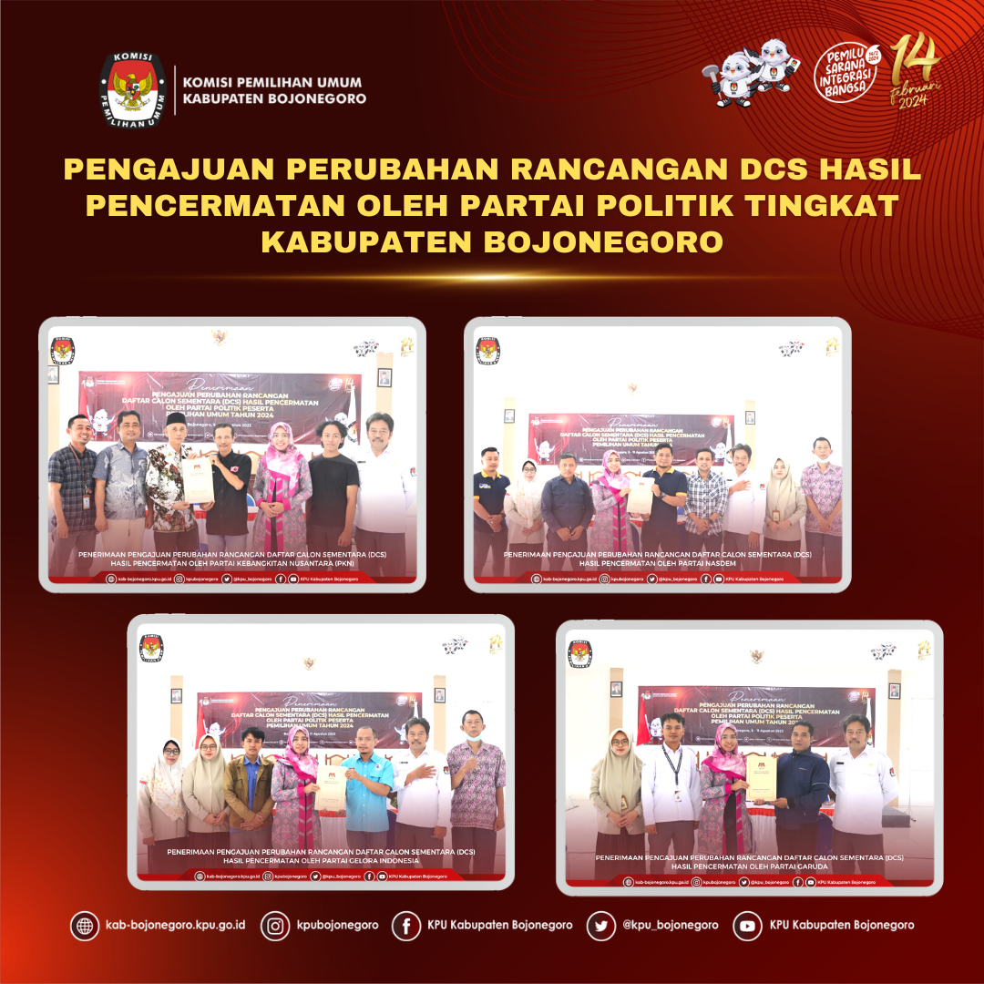Bojonegoro, https://kab-bojonegoro.kpu.go.id/ - Dalam rangka melaksanakan ketentuan Keputusan Komisi Pemilihan Umum Nomor 996 Tahun 2023 tentang Pedoman Teknis Penyusunan Daftar Calon Sementara dan Penetapan Daftar Calon Tetap Anggota Dewan Perwakilan Rakyat, Dewan Perwakilan Rakyat Daerah Provinsi, dan Dewan Perwakilan Rakyat Daerah Kabupaten/Kota, KPU Kabupaten Bojonegoro menerima Pengajuan Perubahan Rancangan Daftar Calon Sementara (DCS) Hasil Pencermatan oleh Partai Politik Peserta Pemilu Tahun 2024 tingkat Kabupaten Bojonegoro.