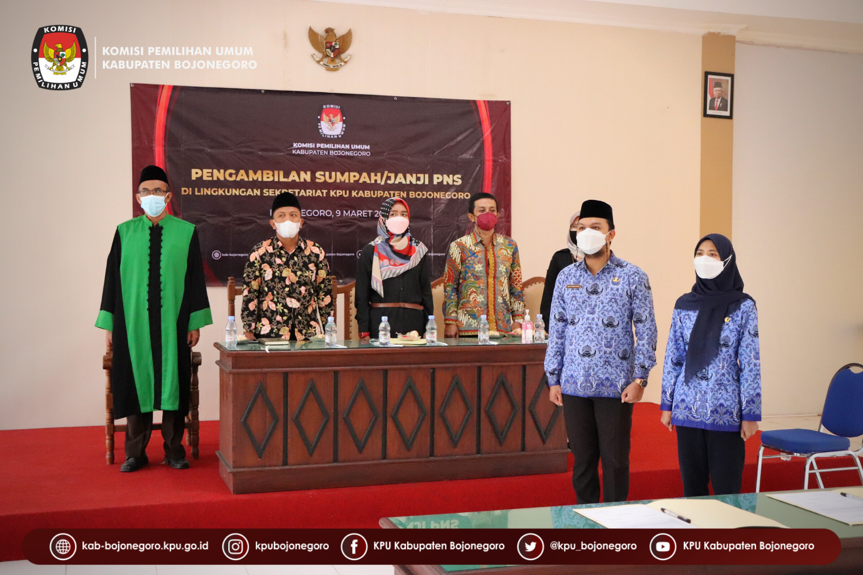 Sebanyak 59 CPNS Sekretariat KPU Provinsi dan Sekretariat KPU Kabupaten/Kota se-Jawa Timur formasi CPNS Tahun 2018 dan 2019 secara serentak mengikuti pengambilan sumpah janji PNS yang dilaksanakan di aula KPU Provinsi Jawa Timur. Adapun KPU Bojonegoro mengikuti prosesi tersebut secara daring, dengan dihadiri dua CPNS yang dilantik yaitu Wahyu Zirwan Astari, S.IP. dan Anis Istiqomah, S.H..