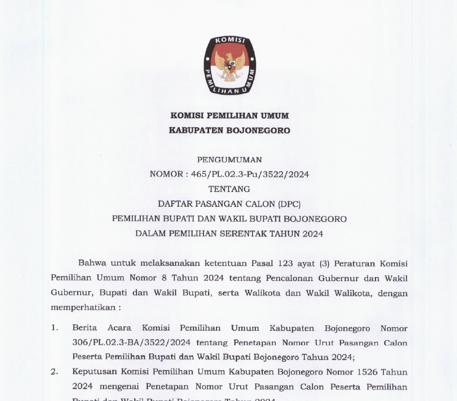 Pengumuman Daftar Pasangan Calon (DPC) Pemilihan Bupati dan Wakil Bupati Bojonegoro Bojonegoro Tahun 2024