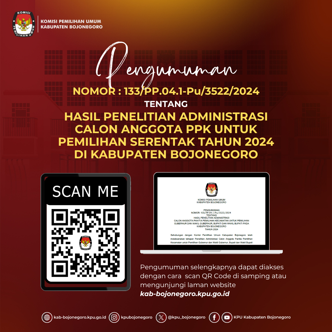 Pengumuman Hasil Penelitian Administrasi Calon Anggota Panitia Pemilihan Kecamatan (PPK) untuk Pemilihan Gubernur dan Wakil Gubernur serta Bupati dan Wakil Bupati pada Kabupaten Bojonegoro Tahun 2024.