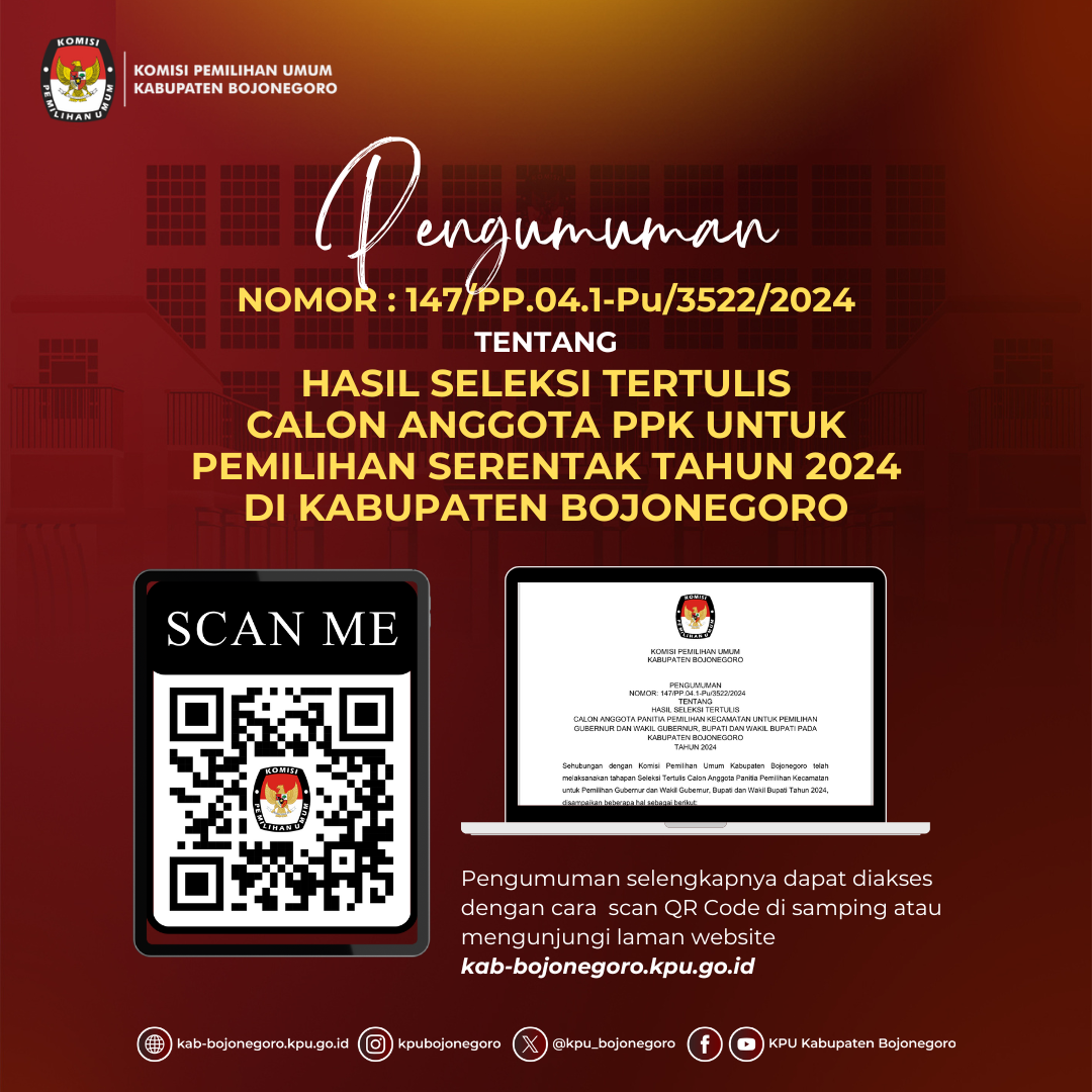Pengumuman Hasil Seleksi Tertulis Calon Anggota Panitia Pemilihan Kecamatan (PPK) untuk Pemilihan Gubernur dan Wakil Gubernur serta Bupati dan Wakil Bupati pada Kabupaten Bojonegoro Tahun 2024.