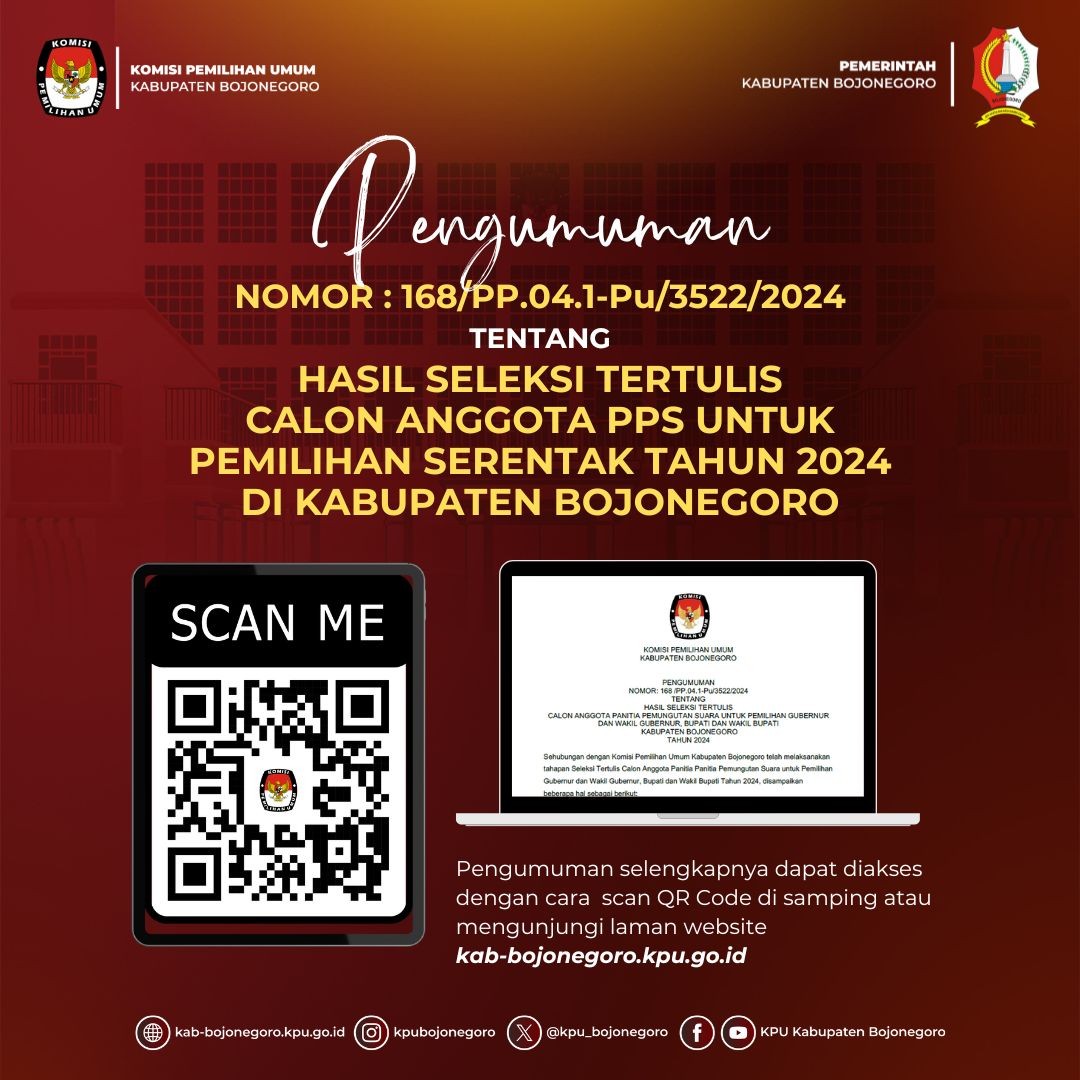 Pengumuman Hasil Seleksi Tertulis Calon Anggota Panitia Pemungutan Suara untuk Pemilihan Gubernur dan Wakil Gubernur, Bupati dan Wakil Bupati Kabupaten Bojonegoro Tahun 2024Pengumuman Hasil Seleksi Tertulis Calon Anggota Panitia Pemungutan Suara untuk Pemilihan Gubernur dan Wakil Gubernur, Bupati dan Wakil Bupati Kabupaten Bojonegoro Tahun 2024.