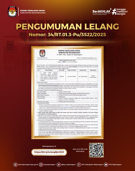 Teman Pemilih, berikut kami sampaikan Pengumuman Lelang Nomor 34/RT.01.3-Pu/3522/2025. Selengkapnya di bit.ly/LelangBjn2025.