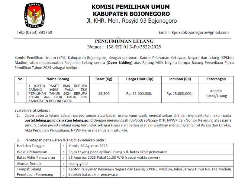 Pengumuman Lelang Paket BMN berupa Barang Habis Pakai Eks Pemilihan Tahun 2024 berupa Kotak dan Bilik pada KPU Kabupaten Bojonegoro.