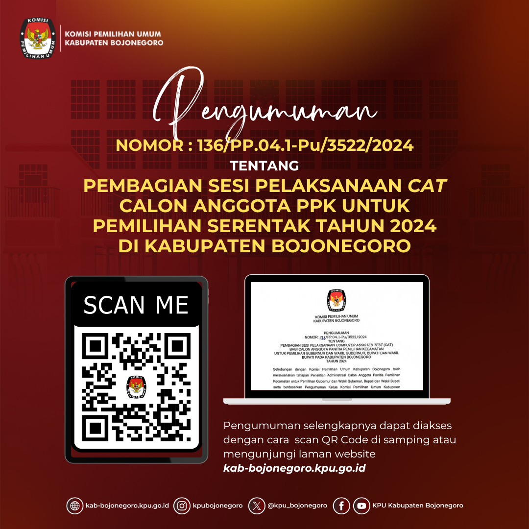Pengumuman Pembagian Sesi Pelaksanaan Computer Assisted Test (CAT) bagi Calon Anggota Panitia Pemilihan Kecamatan (PPK) untuk Pemilihan Gubernur dan Wakil Gubernur serta Bupati dan Wakil Bupati pada Kabupaten Bojonegoro Tahun 2024