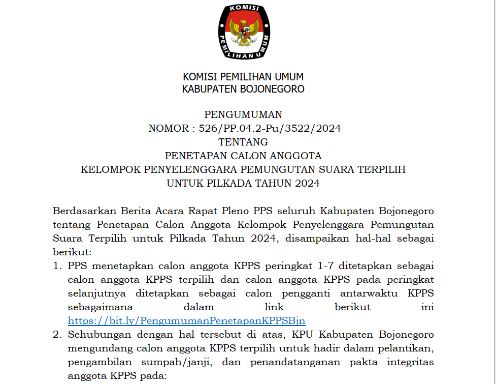 Pengumuman Penetapan Calon Anggota KPPS untuk Pilkada Tahun 2024