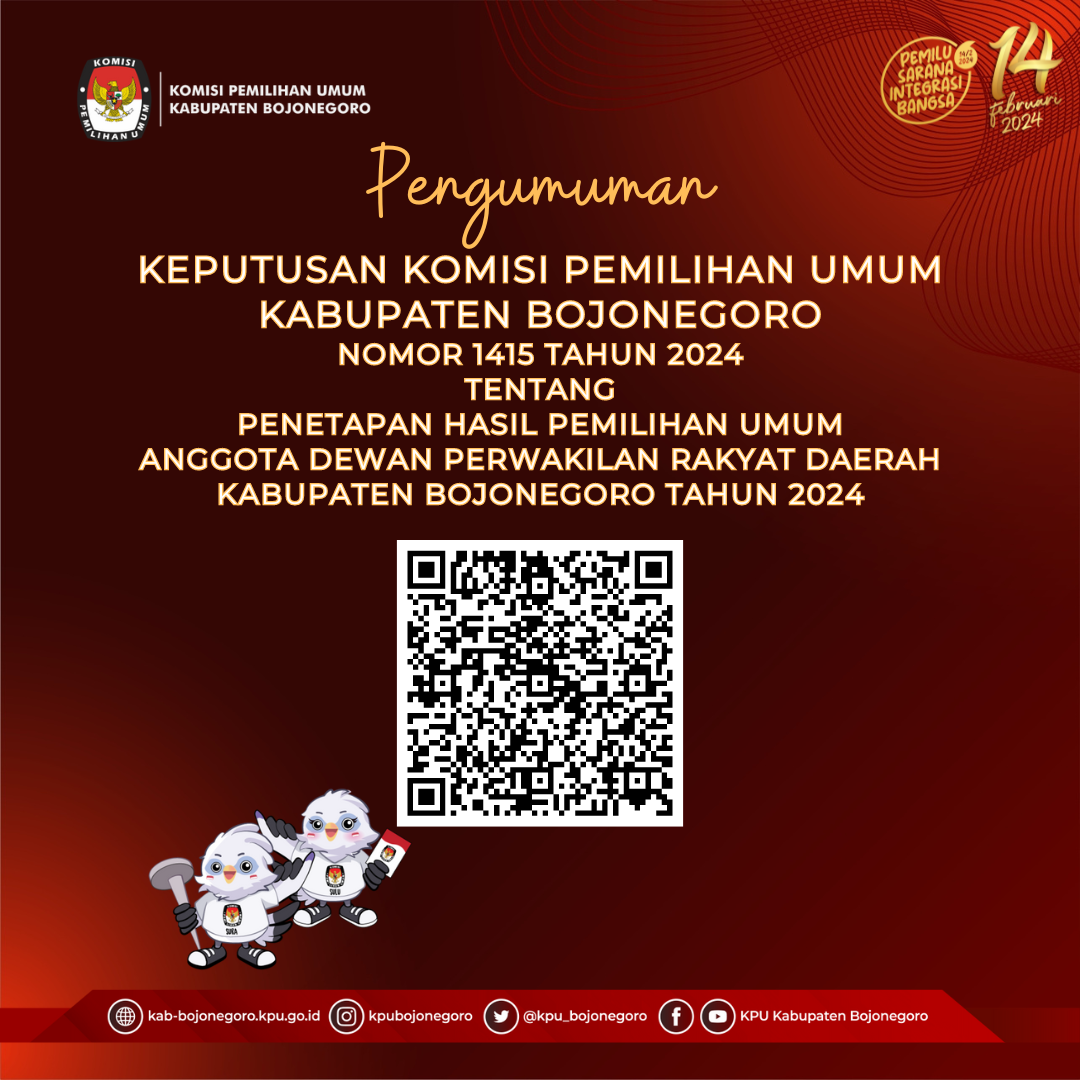 Teman Pemilih, berikut kami sampaikan Pengumuman mengenai Penetapan Hasil Pemilu Anggota DPRD Kabupaten Bojonegoro Tahun 2024 dalam Keputusan Komisi Pemilihan Umum Kabupaten Bojonegoro Nomor 1415 Tahun 2024 tentang Penetapan Hasil Pemilihan Umum Anggota Dewan Perwakilan Rakyat Daerah Kabupaten Bojonegoro Tahun 2024. Selengkapnya, unduh disini.