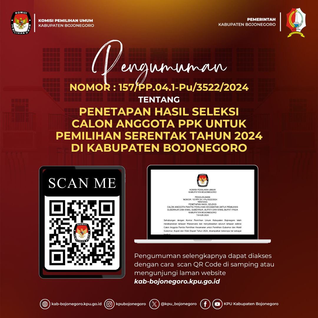 Pengumuman Penetapan Hasil Seleksi Calon Anggota Panitia Pemilihan Kecamatan (PPK) untuk Pemilihan Gubernur dan Wakil Gubernur, Bupati dan Wakil Bupati Tahun 2024 di Kabupaten Bojonegoro