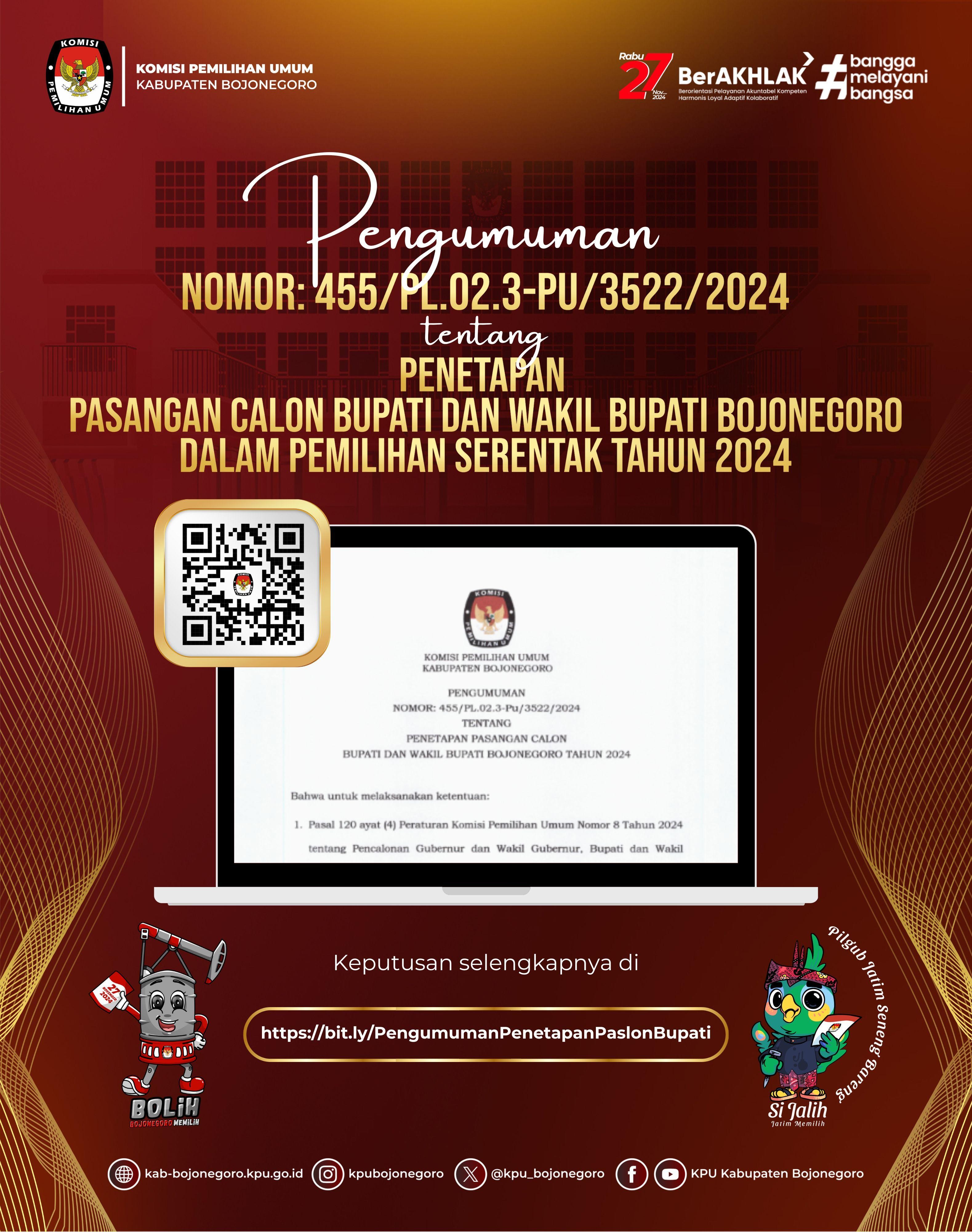 Teman Pemilih, berikut kami sampaikan Pengumuman tentang Penetapan Pasangan Calon Bupati dan Wakil Bupati Bojonegoro dalam Pemilihan Serentak Tahun 2024. Selengkapnya cek Di Sini.