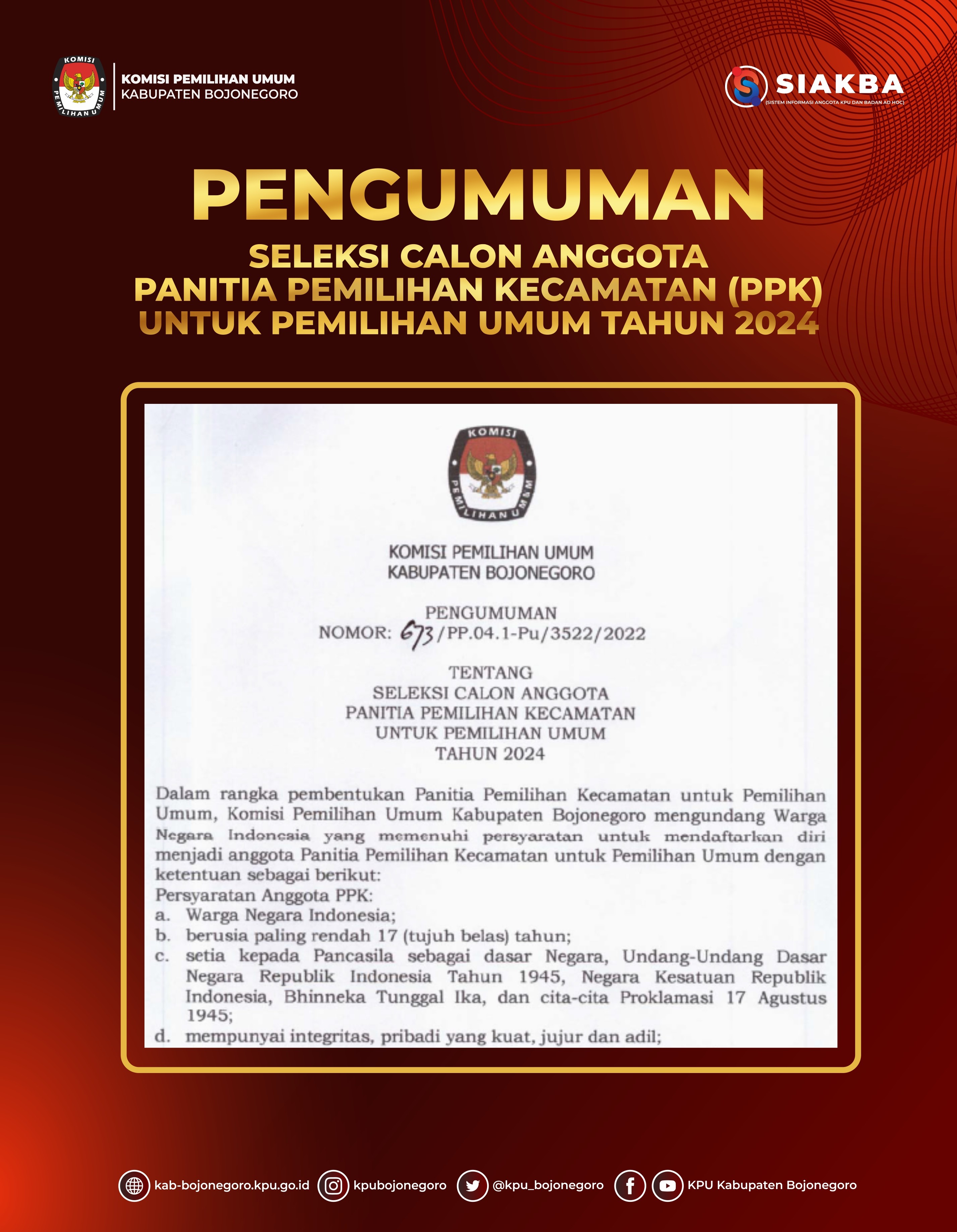 Pengumuman Seleksi PPK KPU Kabupaten Bojonegoro Minggu, 20 November 2022 10:50 932 Unduh disini Bagikan: Dilihat 932 Kali.