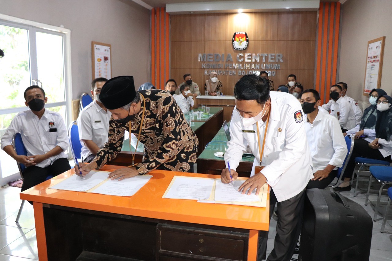 Bojonegoro, kab-bojonegoro.kpu.go.id - Komisi Pemilihan Umum (KPU) Kabupaten Bojonegoro melaksanakan penandatanganan perjanjian kinerja, Kamis (13/01/2022) di ruang Media Center. Kegiatan ini digelar oleh KPU Provinsi Jawa Timur secara daring dan diikuti serentak oleh 38 KPU Kabupaten/Kota se-Jawa Timur. Kegiatan penandatanganan perjanjian kinerja dihadiri oleh seluruh jajaran Komisioner, Sekretariat, serta PPNPN.