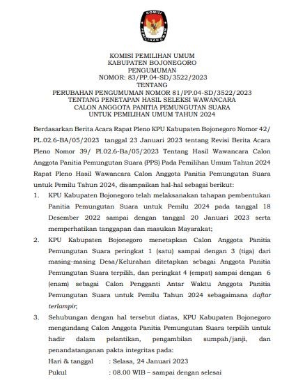 Perubahan Pengumuman Penetapan Hasil Seleksi Wawancara Calon Anggota Panitia Pemungutan Suara untuk Pemilihan Umum Tahun 2024