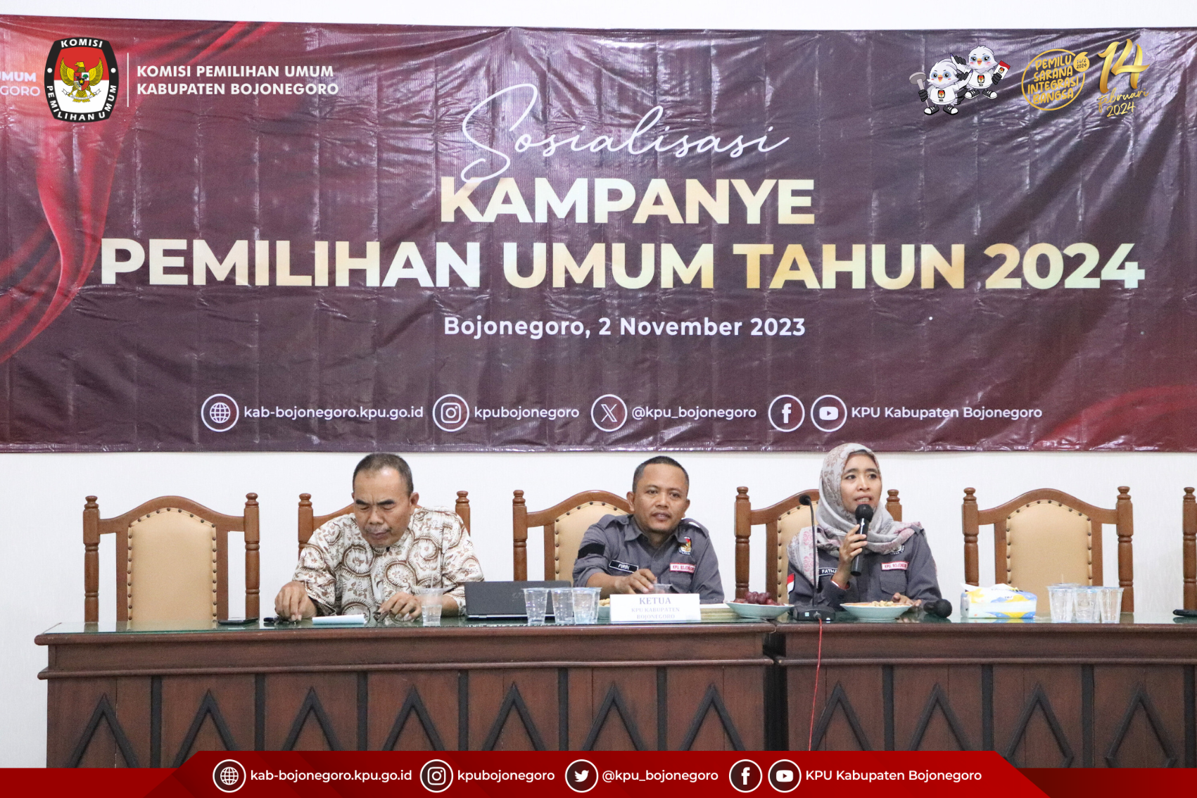 Kegiatan dilanjutkan dengan penyampaian materi oleh Mustofirin, Divisi Sosdiklih, Parmas, dan SDM KPU Kabupaten Bojonegoro mengenai Kampanye Pemilu Tahun 2024. Mustofirin menyampaikan bahwa masa kampanye akan berlangsung selama 75 (tujuh puluh lima) hari yaitu mulai 28 November 2023 hingga 10 Februari 2024.