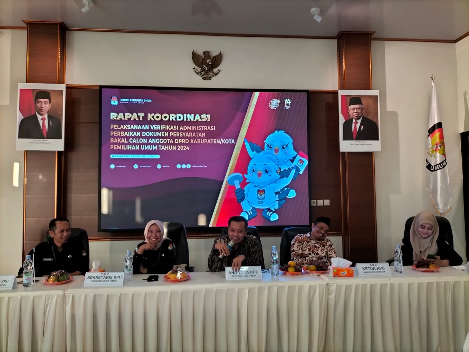 KPU Provinsi Jawa Timur beserta seluruh KPU Kabupaten/Kota se-Jawa Timur membahas masalah - masalah yang timbul dalam proses Pengajuan Perbaikan Dokumen Persyaratan Bakal Calon Anggota DPRD Kabupaten/Kota. KPU Provinsi Jawa Timur berpesan agar KPU Kabupaten/Kota memedomani Surat KPU Nomor 700 dalam hal KPU Kabupaten/Kota memberikan kesempatan kepada Partai Politik untuk mengganti atau melengkapi dokumen persyaratan administrasi bakal calon yang telah diajukan pada rentang waktu tanggal 26 Juni - 9 Juli 2023 setelah menyampaikan persuratan kepada KPU Kabupaten/Kota. Kemudian KPU Kabupaten/Kota akan membuka kembali (unlock) fitur hasil pemeriksaan perbaikan Partai Politik Peserta Pemilu serta memberikan status pengembailan di Silon sampai dengan tanggal 16 Juli 2023. KPU Kabupaten/Kota memastikan Partai Politik Peserta Pemilu tidak melakukan penggantian Bakal Calon pada masa pembukaan kembali fitur Silon sampai dengan 16 Juli 2023.