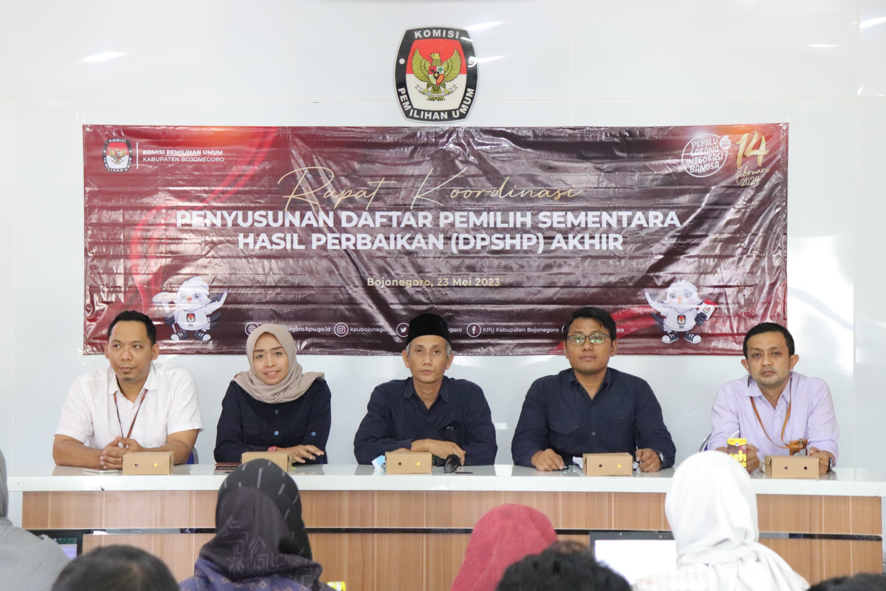 Bojonegoro, kab-bojonegoro.kpu.go.id - Selasa, 23 Mei 2023, KPU Kabupaten Bojonegoro melaksanakan kegiatan Rapat Koordinasi Penyusunan Daftar Pemilih Sementara (DPSHP) Akhir bertempat di Media Center KPU Kabupaten Bojonegoro. Kegiatan rakor dimulai Pukul 13.00 WIB dan dihadiri oleh Bawaslu Kabupaten Bojonegoro serta PPK Divisi Data dan Informasi se-Kabupaten Bojonegoro.
