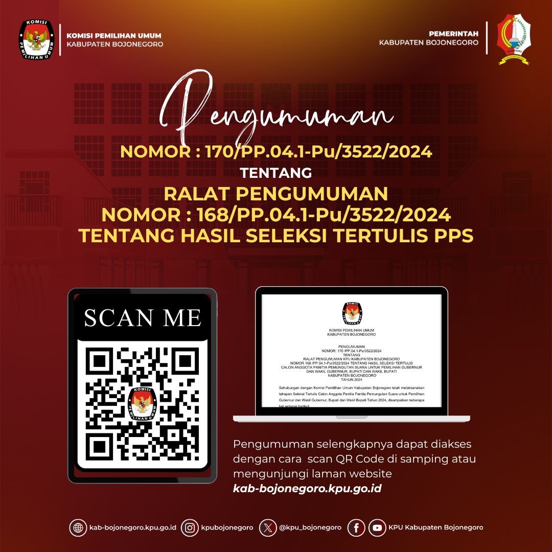Ralat Pengumuman Hasil Seleksi Tertulis Calon Anggota PPS untuk Pemilihan Gubernur dan Wakil Gubernur, Bupati dan Wakil Bupati Bojonegoro Tahun 2024
