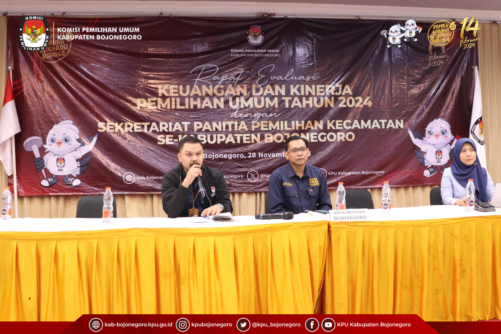 Bojonegoro, kab-bojonegoro.kpu.go.id - Selasa (28/11), KPU Kabupaten Bojonegoro melaksanakan kegiatan Rapat Evaluasi Keuangan dan Kinerja Pemilu Tahun 2024 dengan Sekretariat Panitia Pemilihan Kecamatan (PPK) se-Kabupaten Bojonegoro. Kegiatan rakor mengundang Sekretariat PPK se-Kabupaten Bojonegoro dan narasumber dari Kejaksaan Negeri Bojonegoro dan Kantor Pelayanan Perbendaharaan Negara Bojonegoro (KPPN) Bojonegoro.
