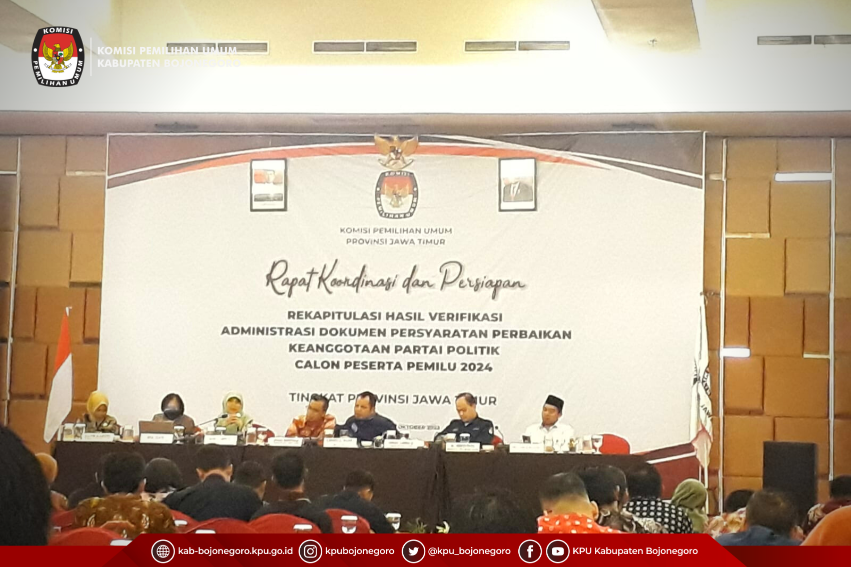 Rapat Koordinasi dan Persiapan Rekapitulasi Hasil Verifikasi Administrasi Dokumen Persyaratan Perbaikan Keanggotaan Partai Politik Calon Peserta Pemilu 2024 Tingkat Provinsi Jawa Timur