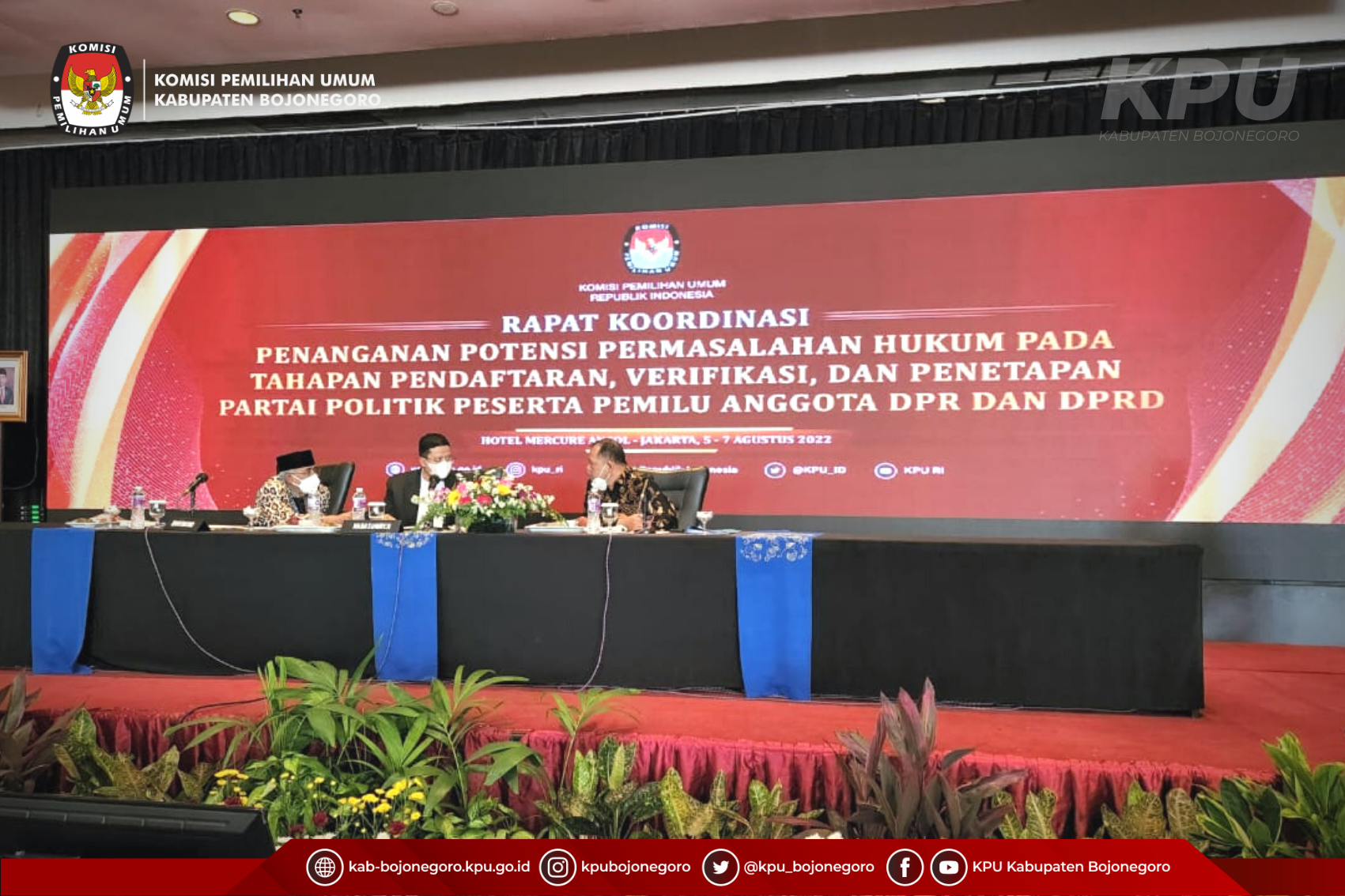 Bojonegoro, kab-bojonegoro.kpu.go.id – Anggota KPU Kabupaten Bojonegoro Divisi Hukum dan Pengawasan, Robby Adi Perwira dan Kepala Sub Bagian Hukum dan SDM, Henny P. Savitri mengikuti kegiatan Rapat Koordinasi Penanganan Potensi Permasalahan Hukum pada Tahapan Pendaftaran, Verifikasi, dan Penetapan Parpol Peserta Pemilu Anggota DPR dan DPRD pada 5-7 Agustus 2022 di Hotel Mercure Jakarta.