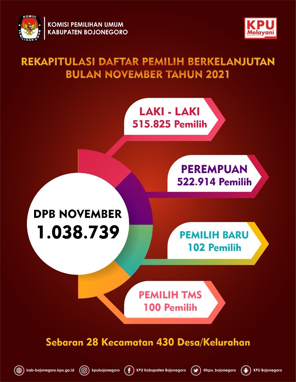 "Dengan demikian, jumlah pemilih hasil pemutakhiran DPB bulan November 2021 sebanyak 1.038.739 pemilih, dengan rincian laki-laki sebanyak 515.825 pemilih, dan perempuan sebanyak 522.914 pemilih," ungkap Fatkhur Rohman, Ketua KPU Kabupaten Bojonegoro. (mit/pin)