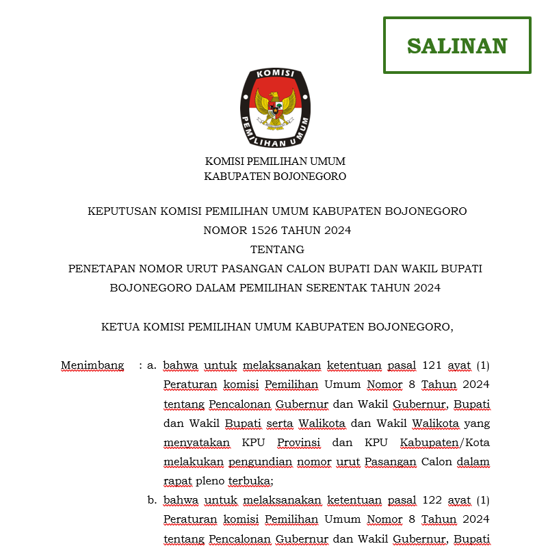 Teman Pemilih, berikut kami sampaikan Salinan Surat Keputusan Komisi Pemilihan Umum Nomor 1526 Tahun 2024 tentang Penetapan Nomor Urut Pasangan Calon Bupati dan Wakil Bupati Bojonegoro dalam Pemilihan Serentak Tahun 2024. Selengkapnya, cek disini.
