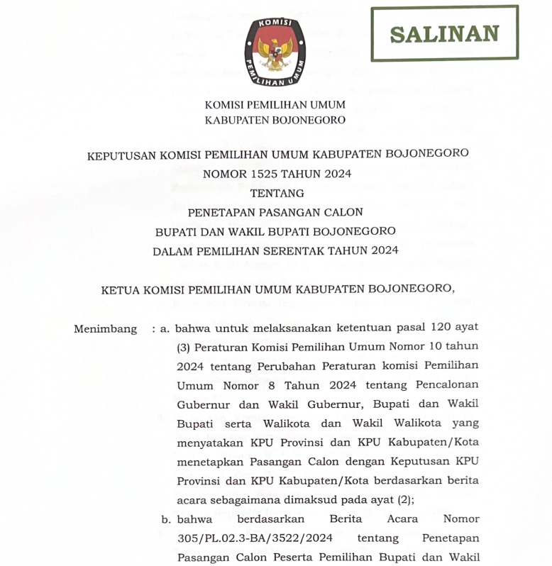 Salinan SK Penetapan Pasangan Calon Bupati dan Wakil Bupati Bojonegoro Dalam Pemilihan Serentak Tahun 2024