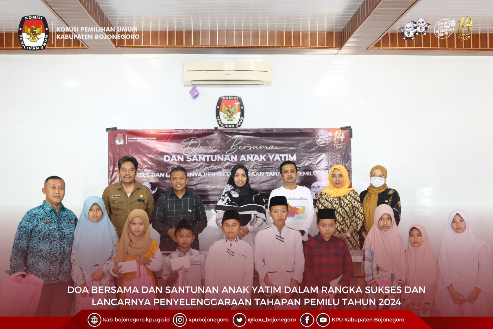 Bojonegoro, kab-bojonegoro.kpu.go.id - KPU Kabupaten Bojonegoro melaksanakan kegiatan Santunan Anak Yatim di Lingkungan Sekretariat KPU Kabupaten Bojonegoro pada hari Jumat, 28 Juli 2023 bertempat di Media Center KPU Kabupaten Bojonegoro. Kegiatan ini dilaksanakan dalam rangka bentuk kepedulian Komisi Pemilihan Umum terhadap generasi bangsa dan mempererat tali silaturahmi serta meningkatkan solidaritas antar sesama. Kegiatan santunan dihadiri oleh anak-anak yatim/piatu dari masyarakat sekitar lingkungan Sekretariat KPU Kabupaten Bojonegoro