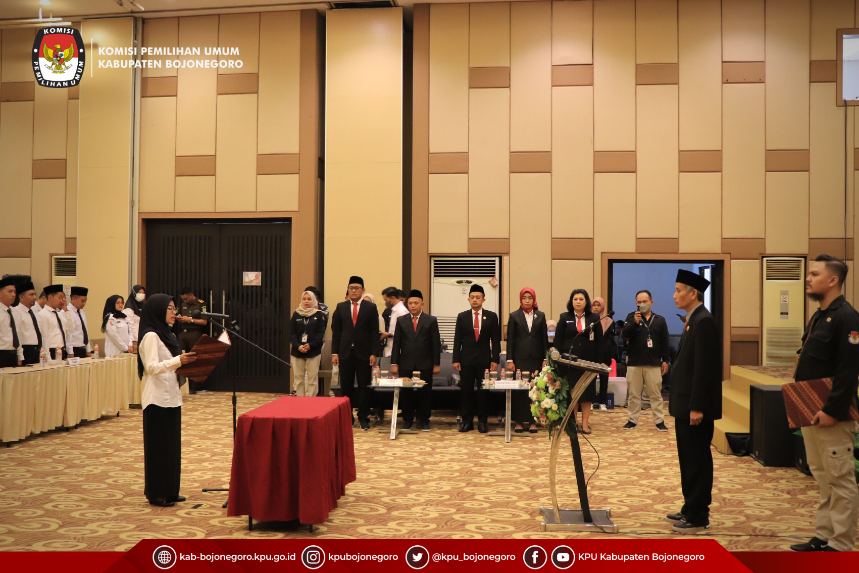 Acara dimulai dengan menyanyikan lagu Indonesia Raya dilanjutkan dengan pembacaan Surat Keputusan Ketua KPU Kabupaten Bojonegoro Nomor 140 Tahun 2022 tentang Penetapan dan Pengangkatan Anggota PPK Kabupaten Bojonegoro untuk Pemilihan Umum Tahun 2024. Selanjutnya pengambilan sumpah/janji oleh Ketua KPU Kabupaten Bojonegoro diikuti dengan penandatanganan Berita Acara Pengambilan Sumpah/Janji, kemudian pembacaan Pakta Integritas oleh perwakilan PPK diikuti dengan penandatanganan Pakta Integritas.