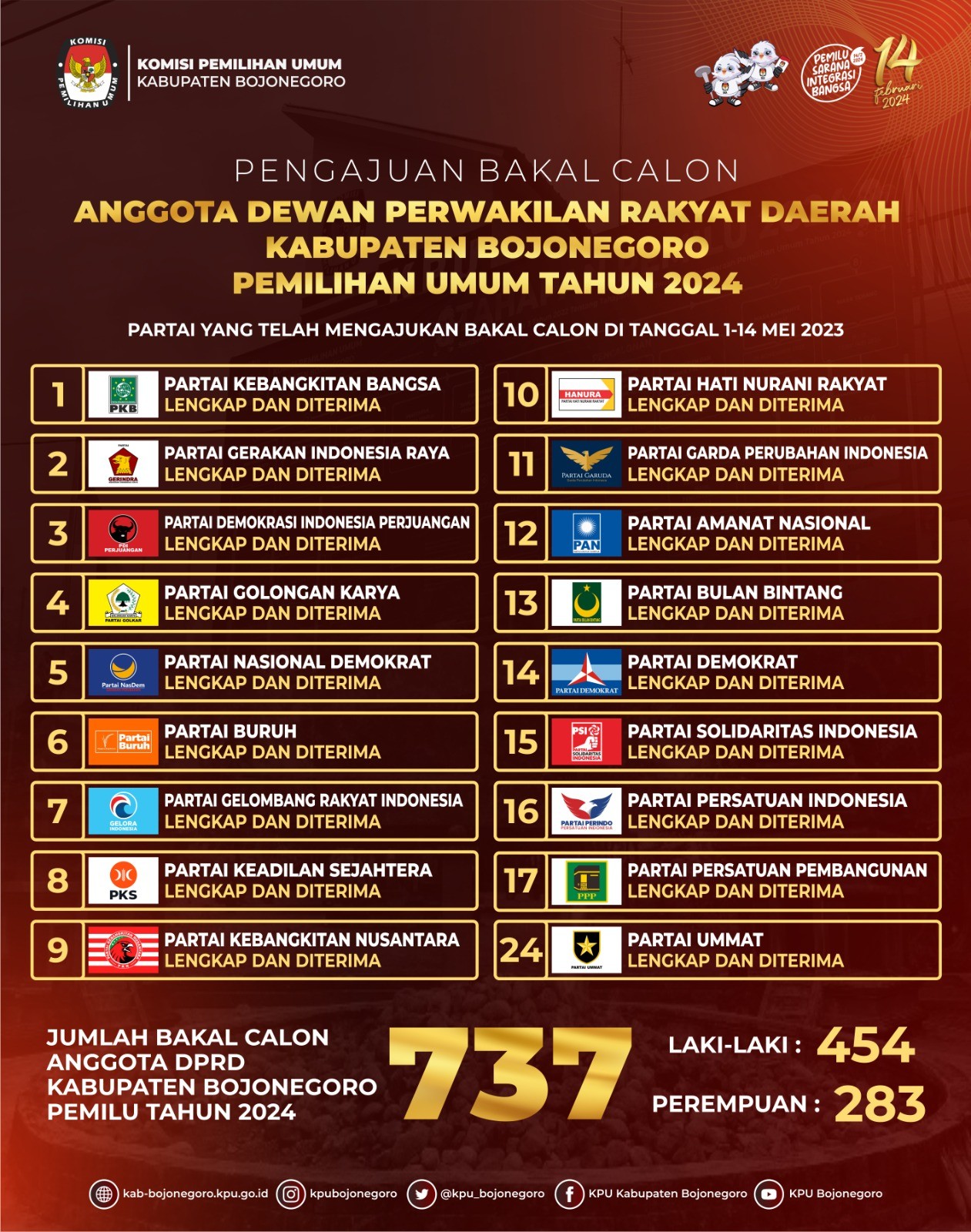 Bojonegoro, kab-bojonegoro.kpu.go.id - Pengajuan Pendaftaran Bakal Calon Anggota Dewan Perwakilan Rakyat Daerah Kabupaten Bojonegoro telah selesai dilaksanakan pada 1 Mei sampai dengan 14 Mei 2023 bertempat di Aula Lantai 2 KPU Kabupaten Bojonegoro. Tercatat sejumlah 737 Bakal Calon telah diajukan oleh Partai Politik Peserta Pemilu Tahun 2024 Tingkat Kabupaten Bojonegoro, dengan rincian laki-laki sejumlah 454 Bakal Calon dan perempuan sejumlah 283 Bakal Calon.