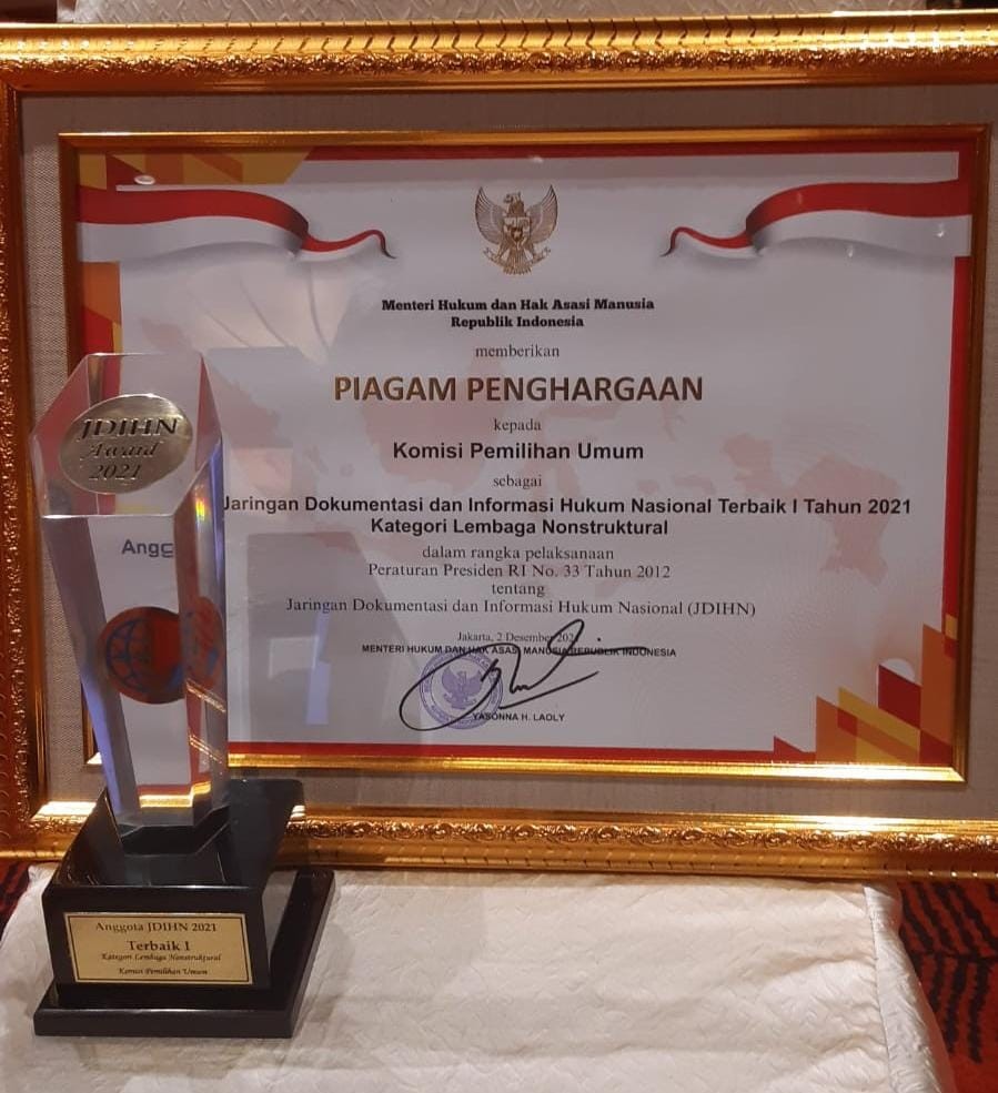Bojonegoro, kab-bojonegoro.kpu.go.id - Komisi Pemilihan Umum Republik Indonesia (KPU RI) patut berbangga. Pada penganugerahan penghargaan anggota Jaringan Dokumentasi dan Informasi Hukum Nasional (JDIHN), KPU RI kembali meraih predikat Terbaik I Kategori Lembaga Nonstruktural, Kamis (02/01/2021).