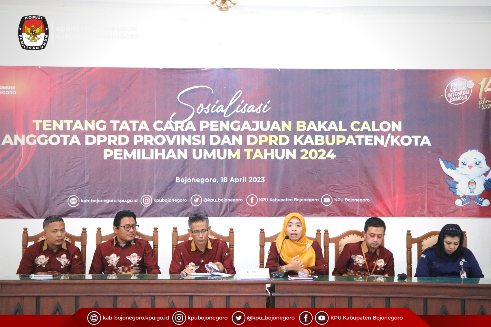 Bojonegoro, kab-bojonegoro.kpu.go.id - Selasa (18/4), KPU Kabupaten Bojonegoro melaksanakan kegiatan Sosialisasi Tata Cara Pengajuan Bakal Calon Anggota DPRD Kabupaten/Kota pada Pemilihan Umum Tahun 2024 bertempat di Aula Lantai 2 KPU Kabupaten Bojonegoro. Kegiatan sosialisasi dihadiri oleh Pimpinan Forkopimda, Ketua dan Sekretaris Partai Politik Peserta Pemilu Tahun 2024, serta Bawaslu Kabupaten Bojonegoro.