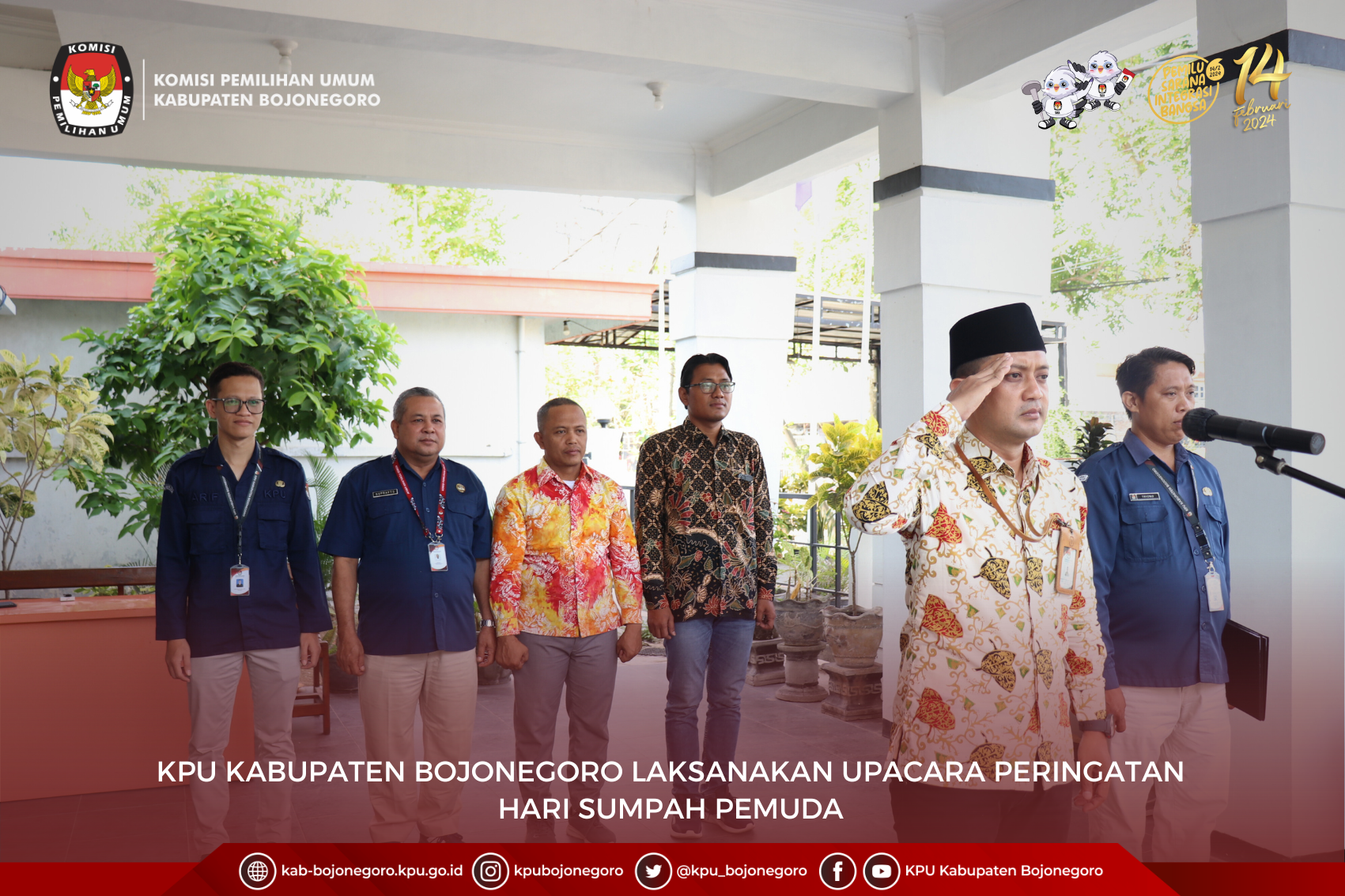 Bojonegoro, kab-bojonegoro.kpu.go.id - Sabtu (28/10), dalam rangka memperingati Hari Sumpah Pemuda ke-95 Tahun 2023, KPU Kabupaten Bojonegoro melaksanakan Upacara Peringatan Hari Sumpah Pemuda bertempat di halaman Kantor KPU Kabupaten Bojonegoro. Kegiatan upacara diikuti oleh Komisioner dan Sekretariat KPU Kabupaten Bojonegoro serta turut dihadiri oleh Kepala Bagian Keuangan, Umum, dan Logistik KPU Provinsi Jawa Timur, Bapak Suprapto.